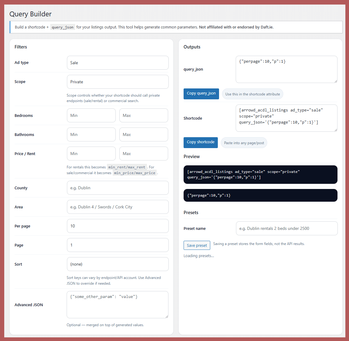 Important: This plugin is an independent integration tool. It is not affiliated with, endorsed by, or supported by Daft.ie (the plugin itself states this in the admin UI).