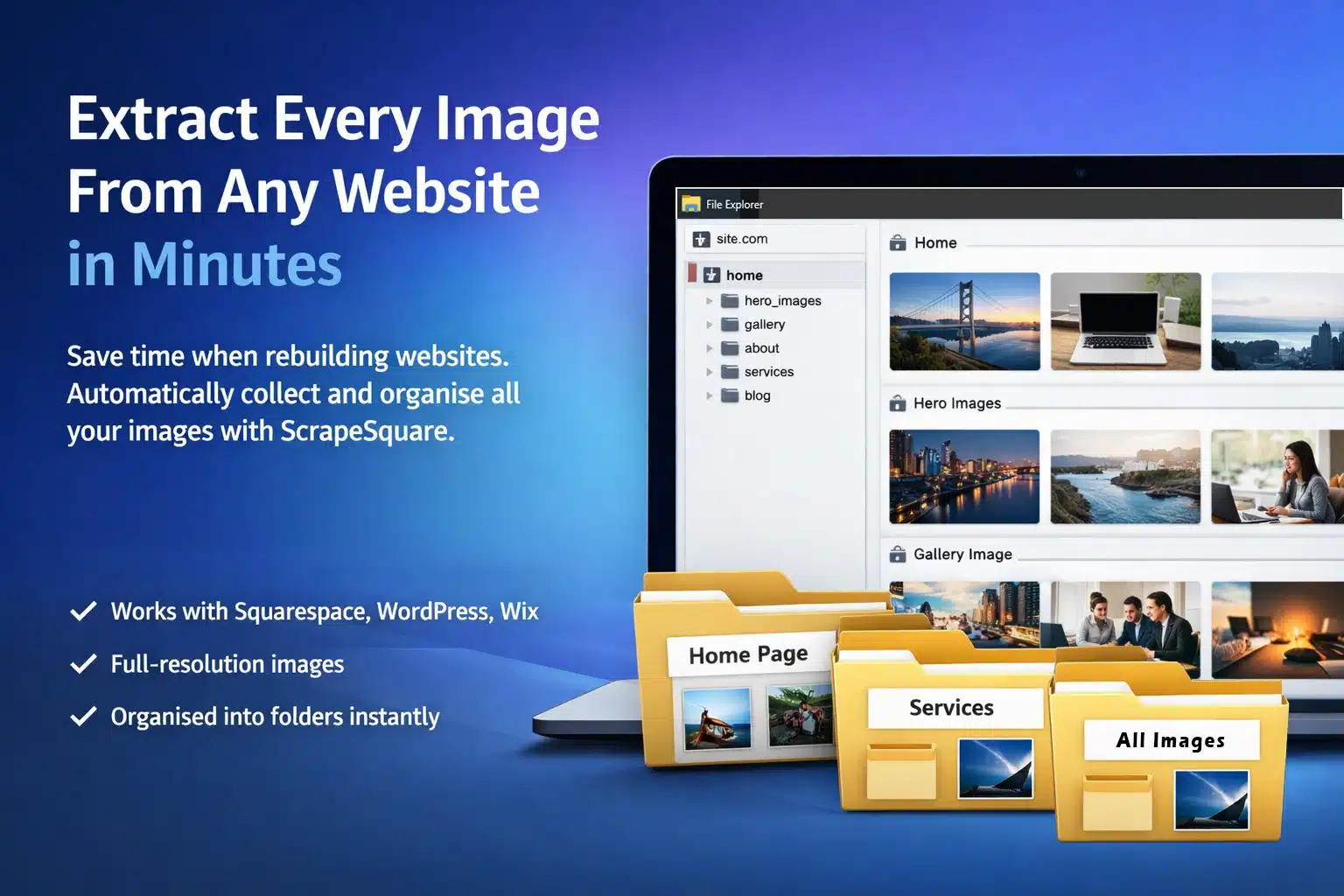 ScrapeSquare includes specific logic designed to extract full-resolution images from Squarespace websites, including gallery images and lightbox assets.